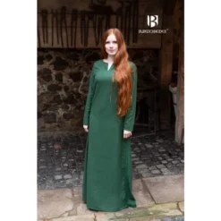 This beautiful dress is suitable for the (early) Middle Ages. The dress falls to the floor, has long sleeves and a V-neck. Wonderful to combine with a hangeroc or ladies’ overdress. Also ideal for Cosplay or LARP. The dress can also be worn under a different color dress for extra warmth or for a beautiful effect.