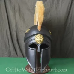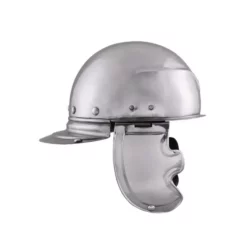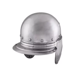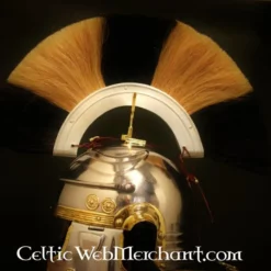 This helmet is a replica of a 19th century find in the Thielle river in Port, near Nidau (Switzerland). The original is from the La Tene III or La Tene D period. The Port type helmet was also worn by the Gauls, presumably at the time of Caesar’s Gaul wars (58-50 BC) and the shape of this helmet was adopted by the Romans and developed into the imperial galea Weisenau. Typical for the Port type helmet are the shape of the cheek guards, the embossed eyebrows and the protruding riveted neck protector. The helmet in delivered including a cap for extra wearing comfort. There are rings on the inside of the cheek guards, so you can fasten the helmet with a chin strap.