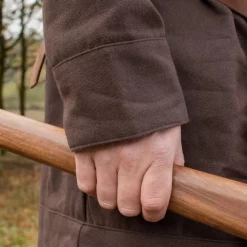The kaftan, or Klappenrock, is a garment that originated with the nomadic steppe people, such as the Magyars, Huns and Avars. Early medieval people in western Europe, who traded with the steppe people, have adopted this garment. The kaftan was especially popular among the Rusvik Vikings, with numerous decorations being added to the garment. The Anglo-Saxons and Vikings in Scandinavia also wore a caftan. There are various visual historical sources for early medieval people wearing kaftans, for example the warriors on the Sutton Hoo helmet. Archaeological remains have been found in Haithabu. This replica of an early medieval caftan is made of sturdy cotton and is best worn with a belt. It reaches to the knees, just like the originals. Please note: depicted accessories like the belt and the fur are not included.