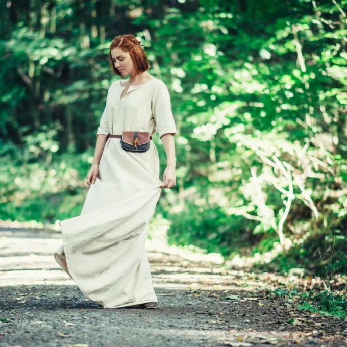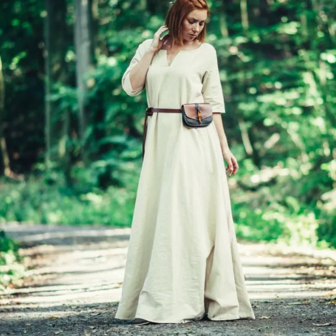 Universal dresses like this were worn by different people in Europe from the early to the high Middle Ages. Remnants of originals have been found and many images have been preserved in medieval manuscripts. Because the dress is suitable for different periods, you can adapt it to your own wishes with accessories such as belts, bags and surcottes. This way you can use it for several outfits. The dress has a V-neck and short sleeves. That’s why it’s great for hot days. You can use it as a slip dress, wear it separately or combine it with a hangeroc, apron or surcotte.