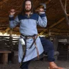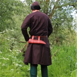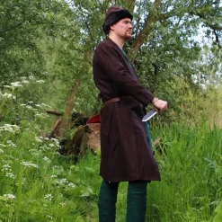 An example of a short asymmetrical caftan was found in Haithabu. In some graves in Birka, brooches are found at hip-level, which suggests caftans were closed with a brooch or pin. But of course the caftan can also be closed with a belt.