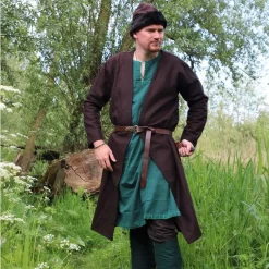 An example of a short asymmetrical caftan was found in Haithabu. In some graves in Birka, brooches are found at hip-level, which suggests caftans were closed with a brooch or pin. But of course the caftan can also be closed with a belt.