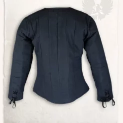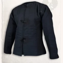 This gambeson is made after 15th century originals. This model gambeson was often worn under plate armor like the early gothic armour. Leather straps and aglets can be attached to the gambeson, to fasten armour. The gambeson can be closed at the front with laces. The exterior of this gambeson is made of rough canvas. The inside is made of breathable cotton and wool felt.