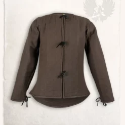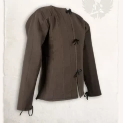 This gambeson is made after 15th century originals. This model gambeson was often worn under plate armor like the early gothic plate armour. The 15th century aristocracy was very fashionable and also armour and gambesons were fashion items. Straps and aiglets can be attached to the gambeson, to fasten armour. The gambeson can be closed at the front with laces. The exterior of this gambeson is made of rough canvas. The inside is made of breathable cotton and wool felt.