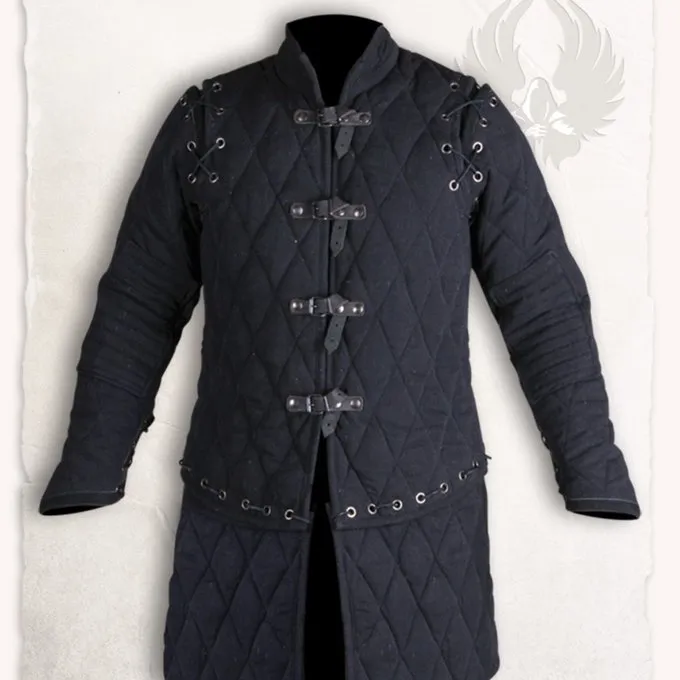 Material: cotton canvas, polyester, leather / Colour: black / Size: S up to XXL / Set of gambeson, gambeson arms and tassets / Based on a historical original