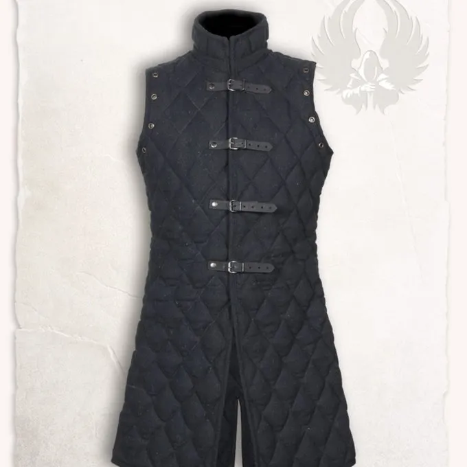 This sleeveless gambeson is ideal for creating a LARP or reenactment character. The gambeson has leather straps at the front that are closed with buckles. The outside of this gambeson is made of rough woven cotton canvas. It has a polyester padding. At the arms, this gambeson has lace holes for fastening the matching Arthur gambeson arms or armour parts.
