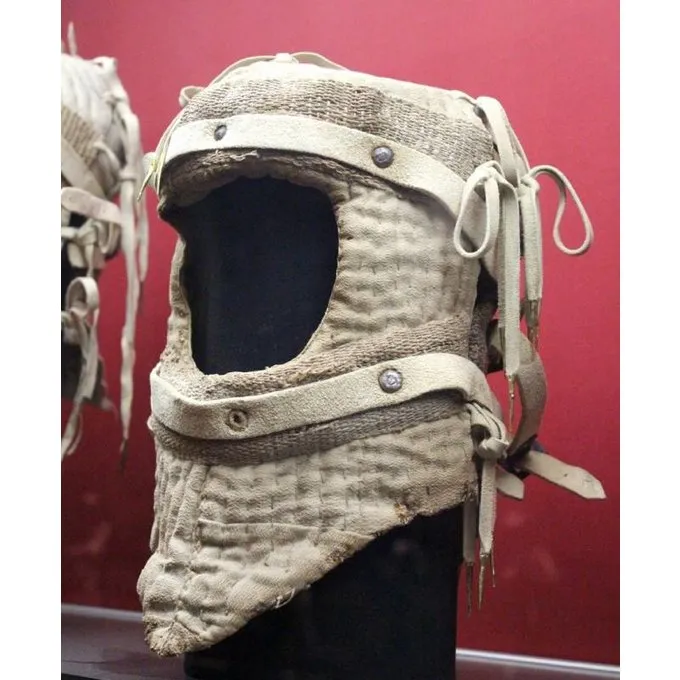 This arming cap is made of canvas and linen and has a woolen lining.